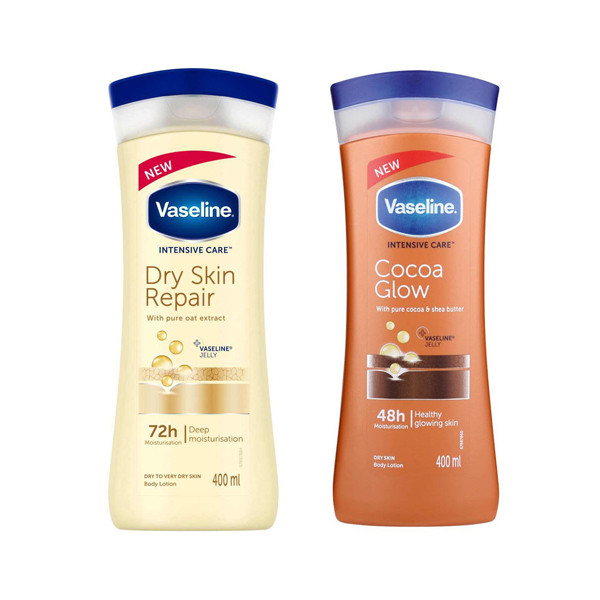 لوسیون بدن وازلین مدل DRY INTENSIVE CARE حجم 400 میلی لیتر به همراه لوسیون بدن وازلین مدل Cocoa Glow حجم 400 میلی لیتر