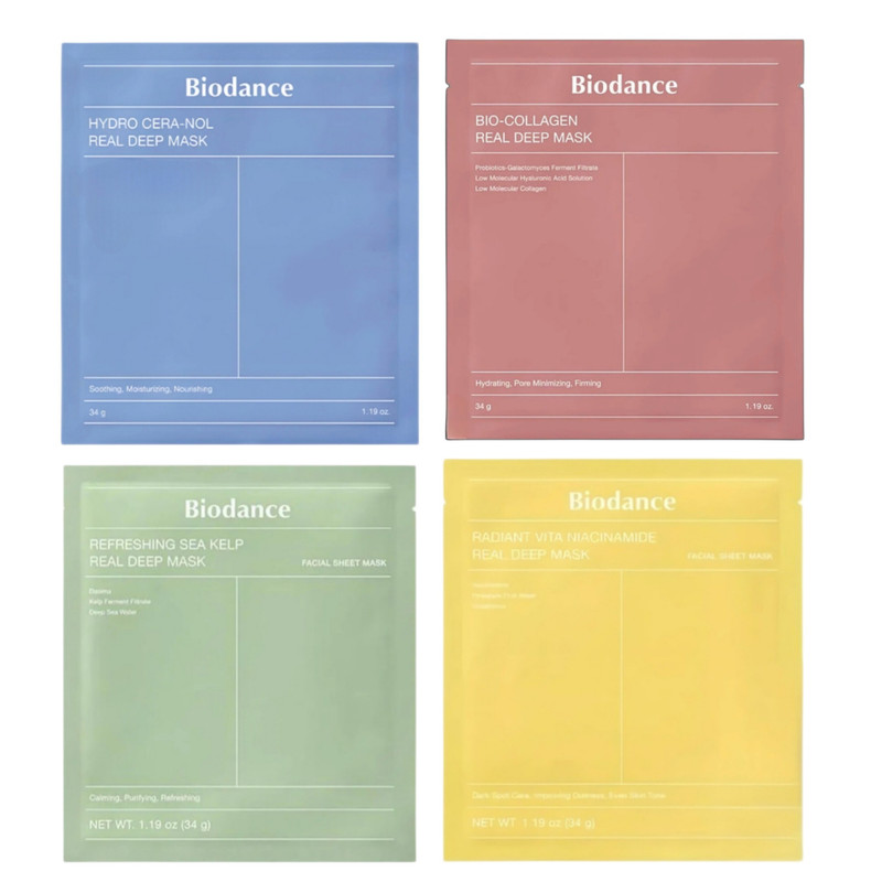 ماسک صورت بایودنس مدل کلاژن جلبک دریایی آبرسان نیاسینامید مناسب انواع پوست وزن 34 گرم بسته 4 عددی