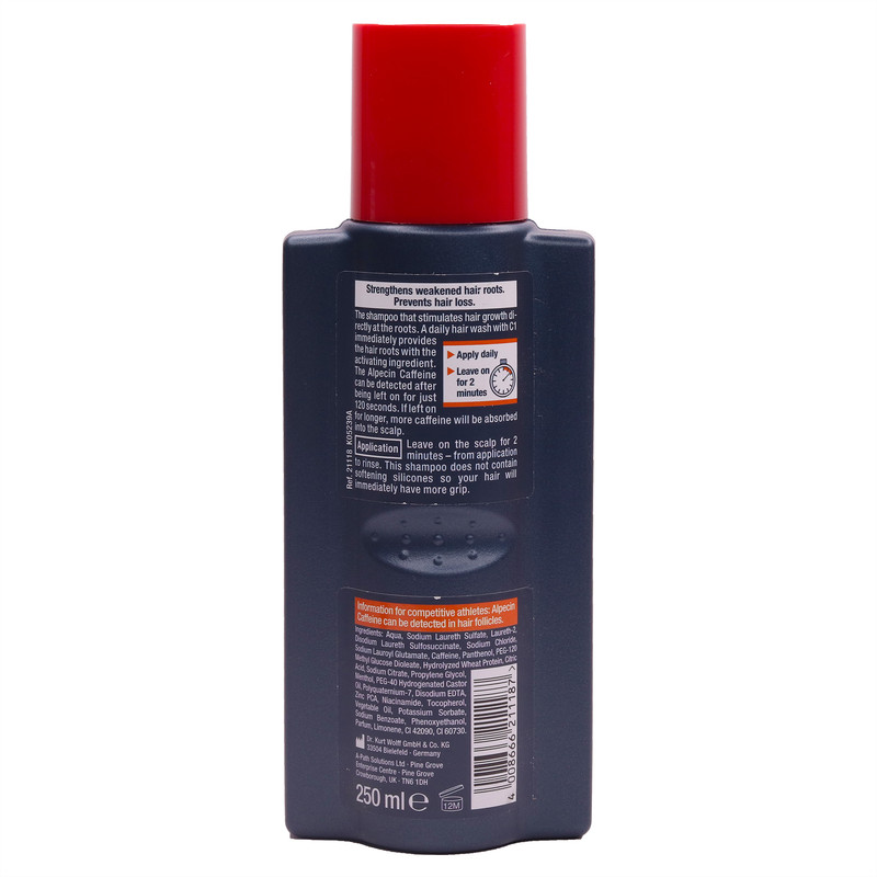 شامپو کافئین دار و ضد ریزش C1 آلپسین ALPECIN با بهره مندی از خواص کافئین به فولیکول های مو انرژی می بخشد و موجب رشد بهتر و سالم تر آن می گردد. زینک و نیاسین موجود در این شامپو، تارهای مو را تقویت می کنند و موجب استحکام آن ها می گردند. این محصول می تواند از ریزش مو جلوگیری کند و همچنین سرعت احیا و رشد مجدد تارهای مو را بهبود بخشد. این شامپو فاقد مواد مضر همچون سیلیکون است و در درازمدت به مو آسیب نمی زند. این محصول می تواند هر روز برای شستشوی سر مورد استفاده قرار گیرد.