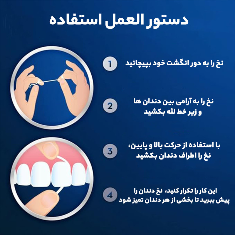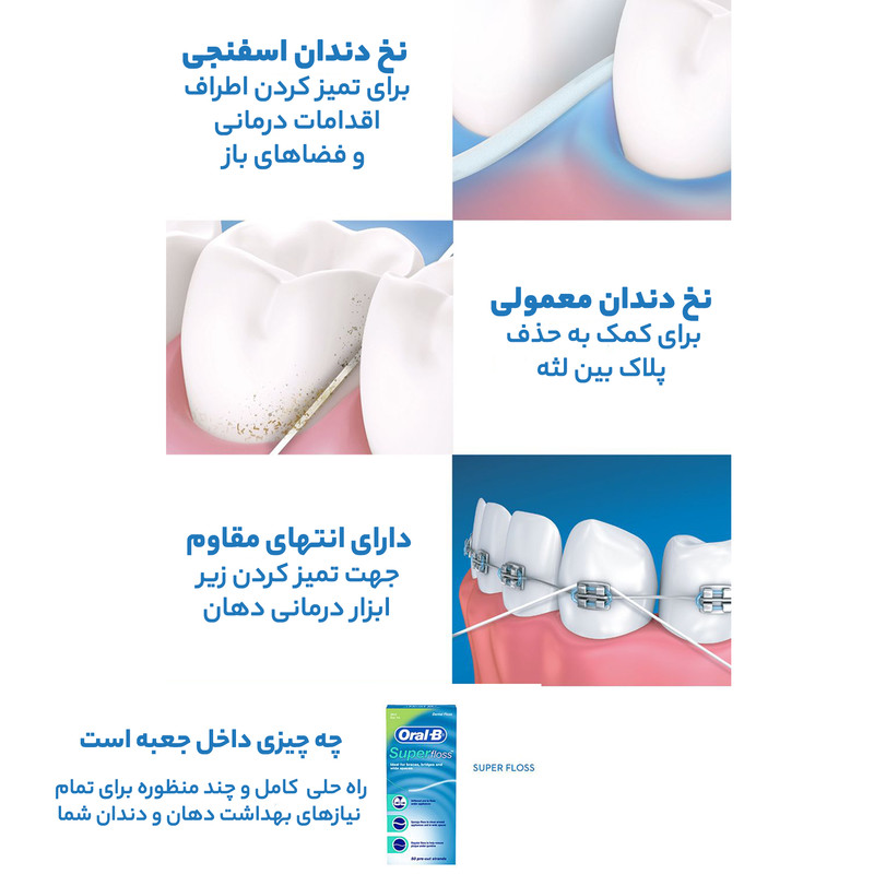سایر مشخصات: - 50 رشته نخ دندان با طعم نعناع- مناسب جهت تمیز کردن براکتها، بریجها و فضاهای باز بین دندانی- بسیار مقاوم برای استفاده دندانهای ارتودنسی شده