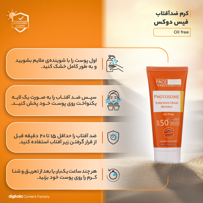 راهنمای استفاده : قبل از مواجه شدن با نور خورشید، میزان کافی از کرم ضد آفتاب را بر مناطقی از پوست که در معرض نور خورشید قرار دارند، بمالید. در صورت نیاز مصرف کرم را تجدید نمایید.