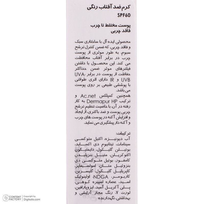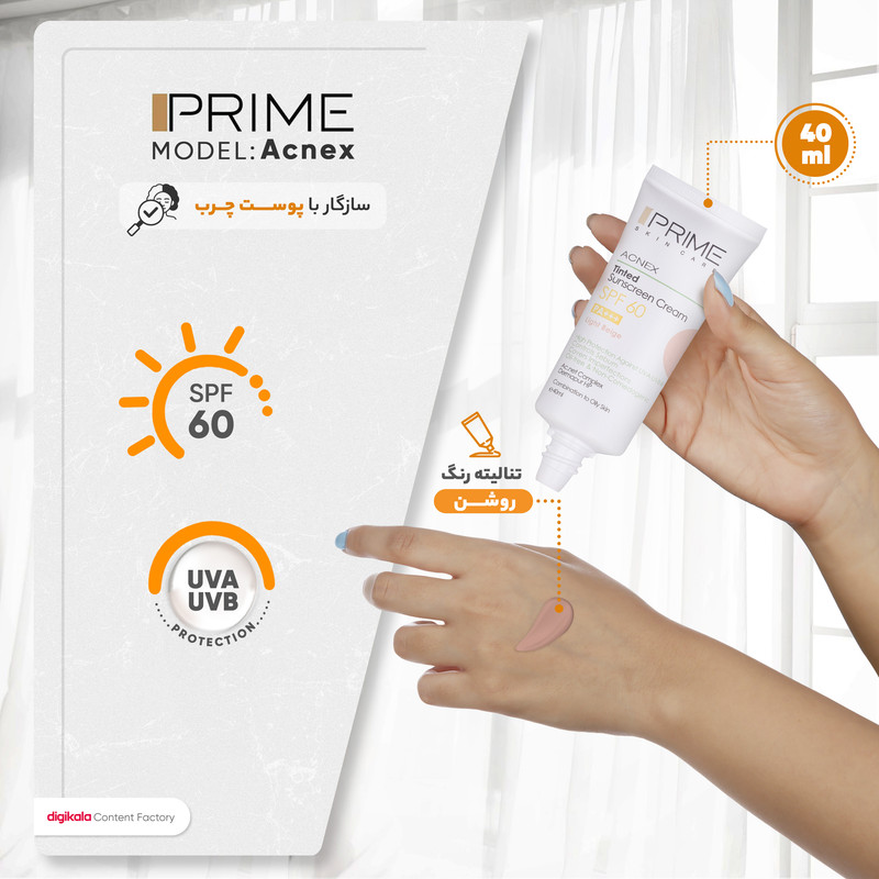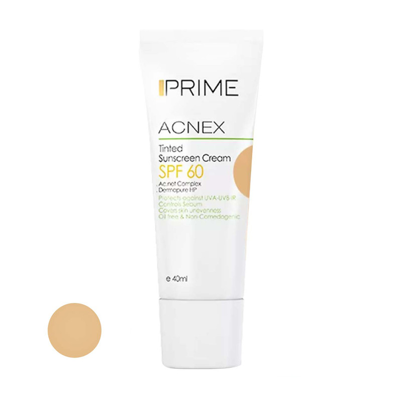 کرم ضدآفتاب رنگی پرایم SPF60 مدل Acnex، مناسب پوست‌های چرب، حجم 40 میلی‌لیتر